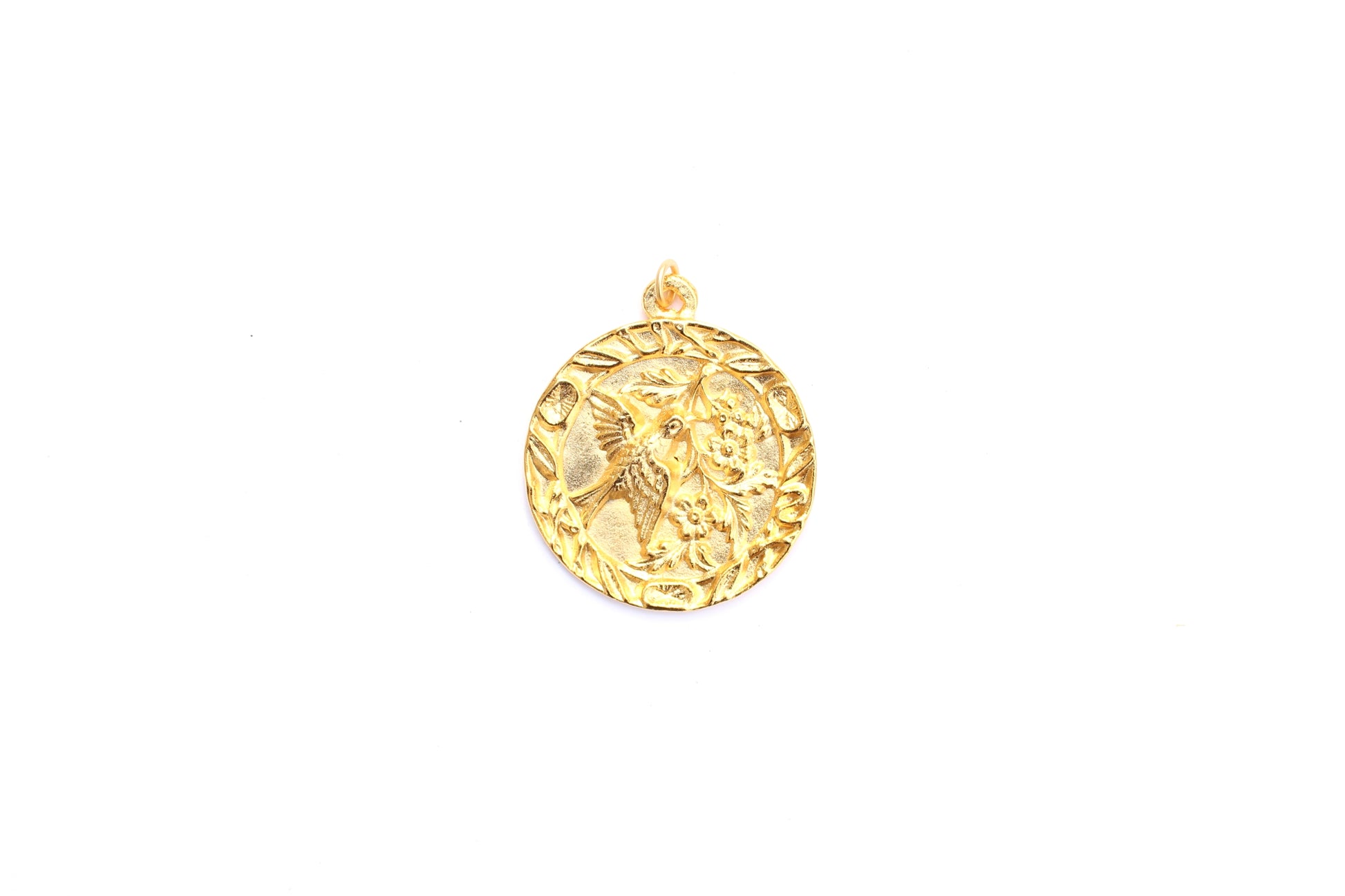The round coin shape adds a touch of timeless elegance, making this pendant a versatile accessory suitable for any occasion. Meticulously crafted by Spring Street Studios, the Flight of Nature Pendant is a celebration of the harmonious connection between the avian world and the beauty of blossoming flowers.